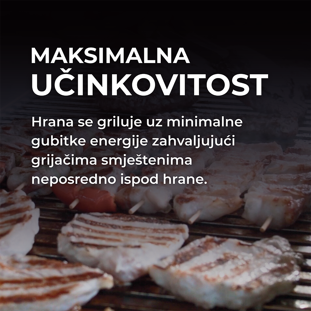 Hrana na roštilju peće se uz minimalnu potrošnju energije zahvaljujući činjenici da su grijači smješteni odmah ispod hrane.